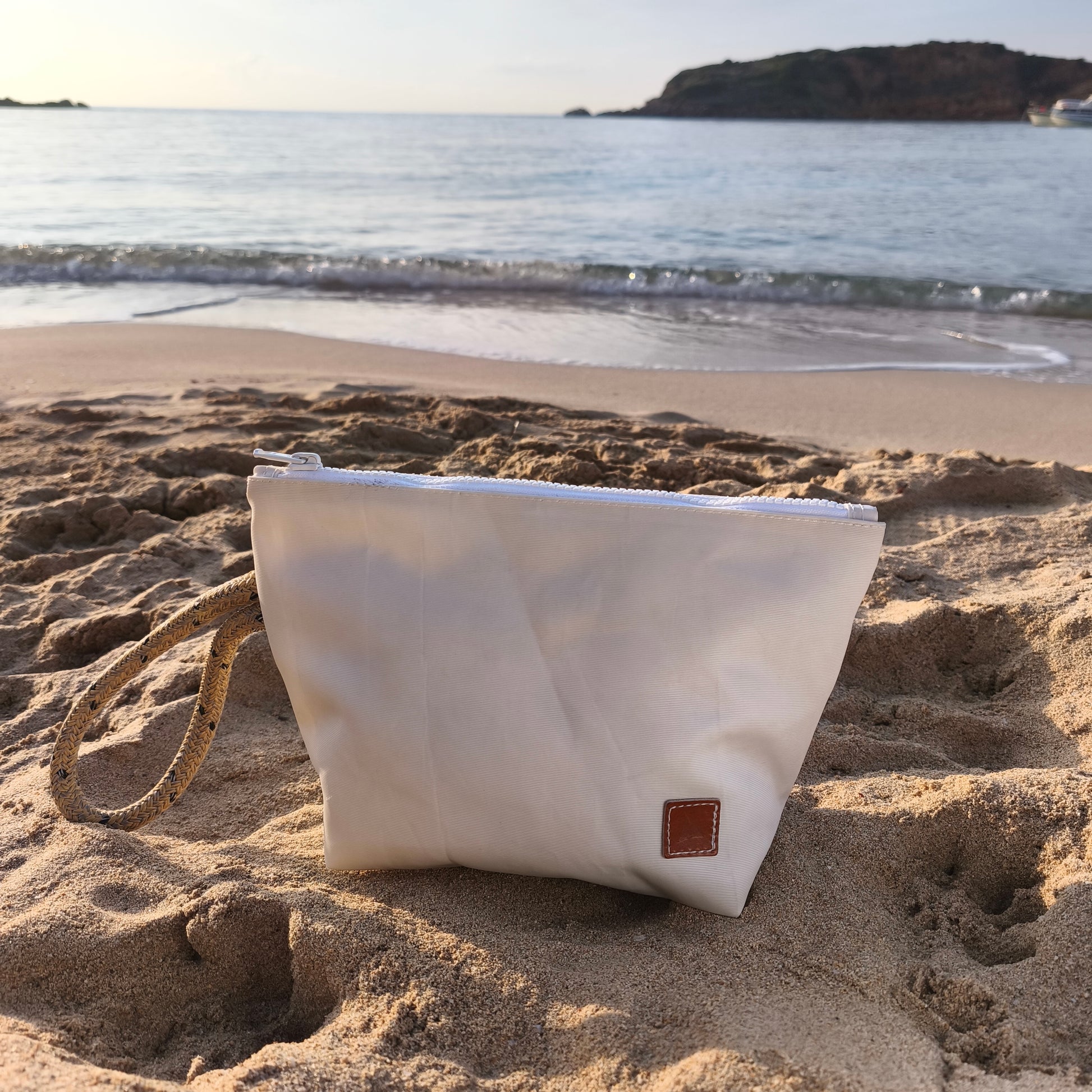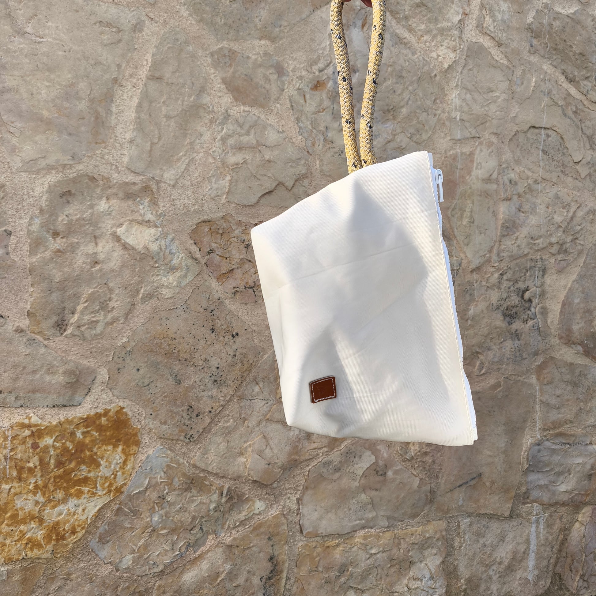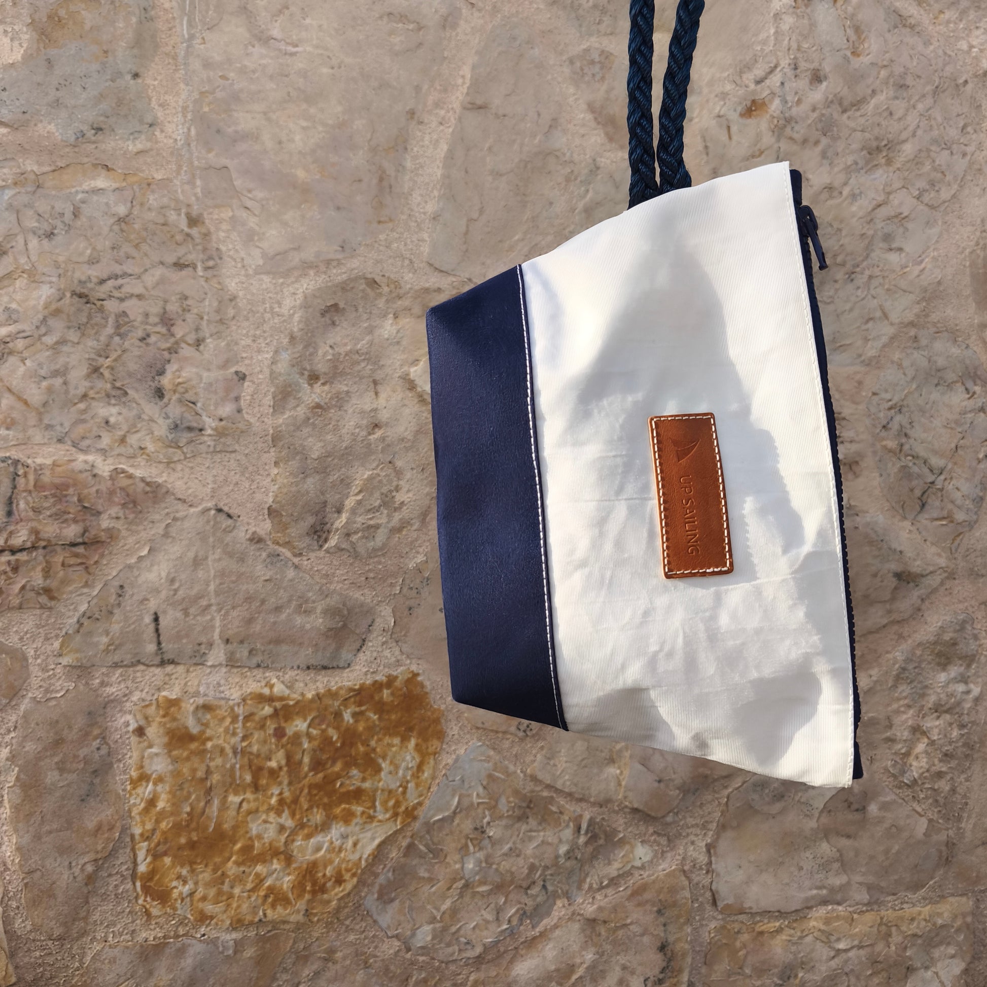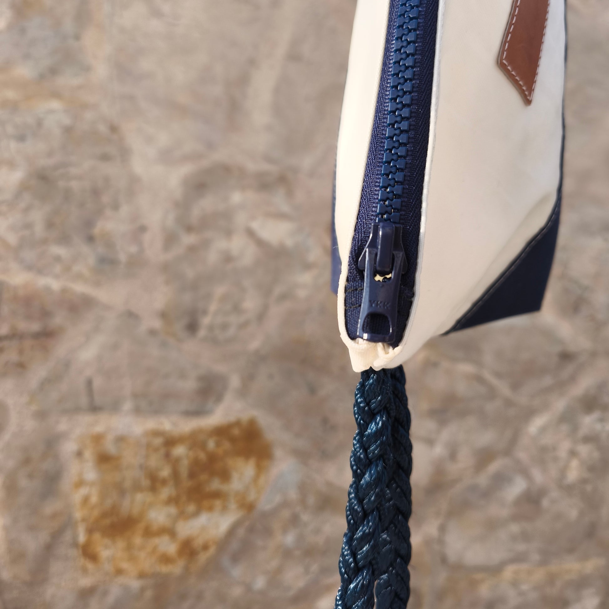 Cada modelo incluye un forro interior hecho con spinnaker recuperado, ideal para proteger tus objetos y de fácil limpieza. La cremallera náutica reforzada garantiza durabilidad, y el detalle único son las cuerdas recuperadas de barcos, que le dan carácter y autenticidad a cada bolso.