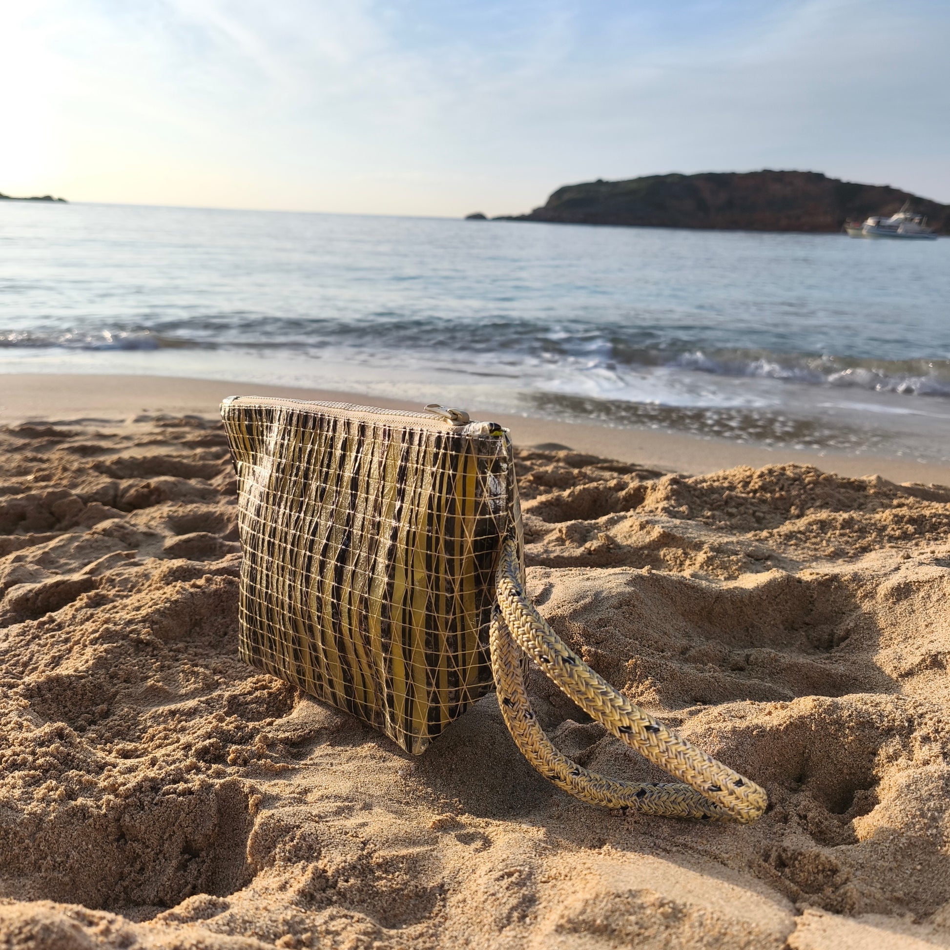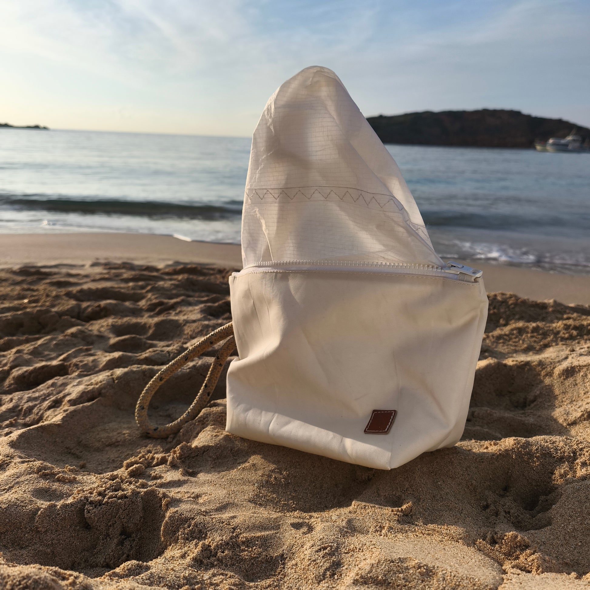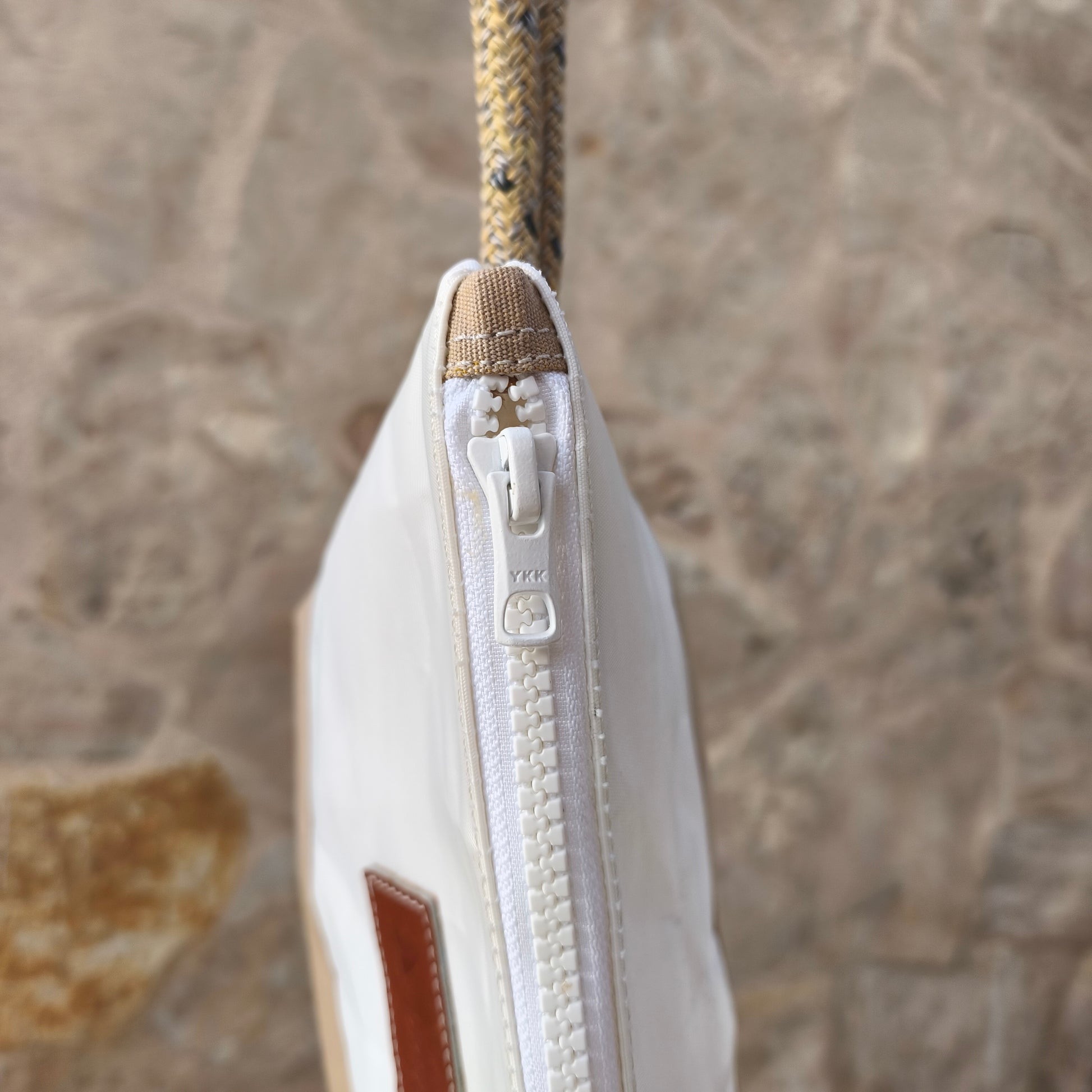 Cada modelo incluye un forro interior hecho con spinnaker recuperado, ideal para proteger tus objetos y de fácil limpieza. La cremallera náutica reforzada garantiza durabilidad, y el detalle único son las cuerdas recuperadas de barcos, que le dan carácter y autenticidad a cada bolso.