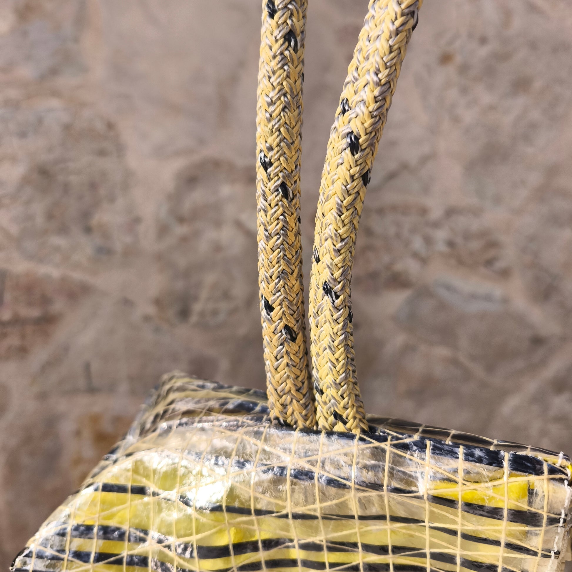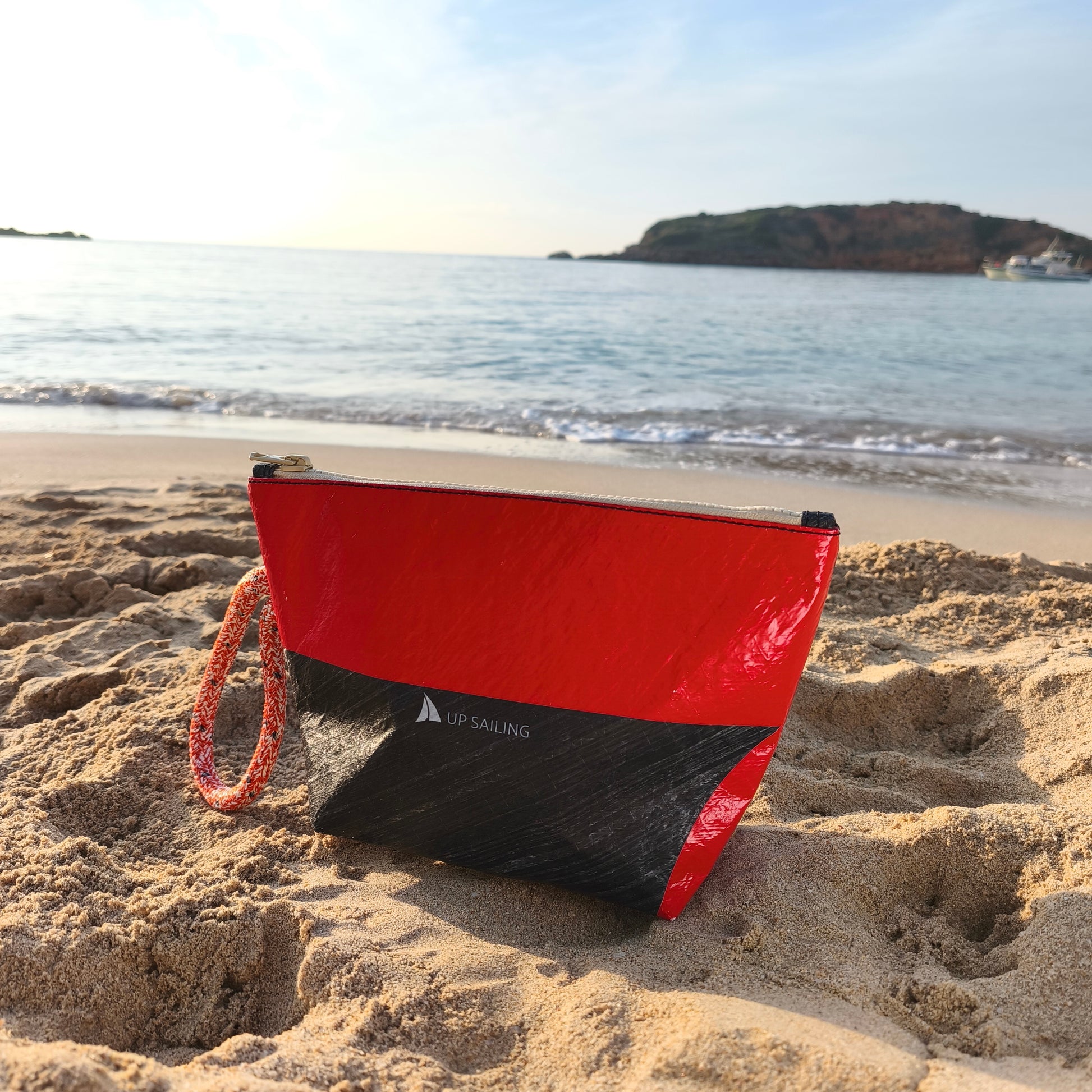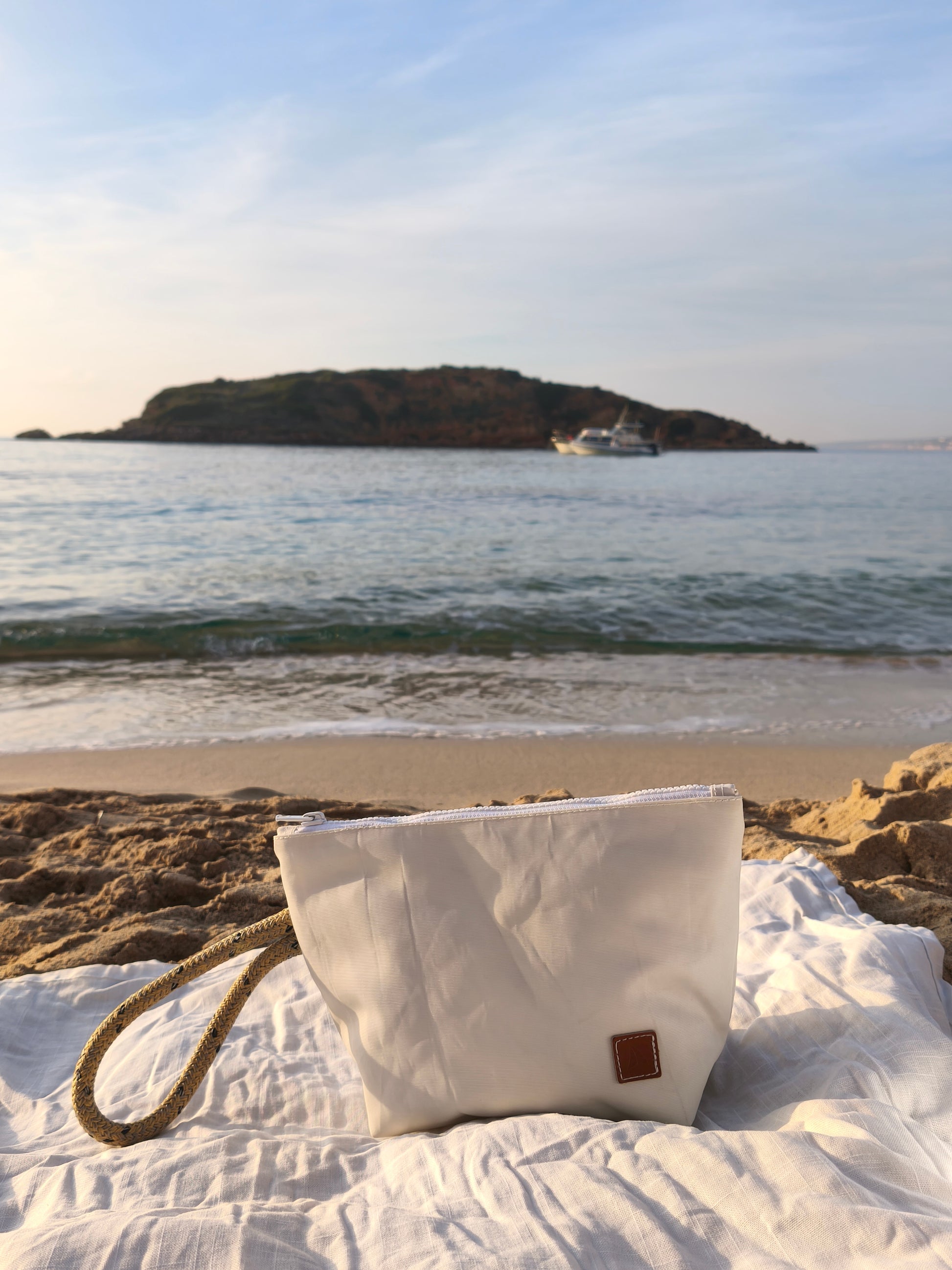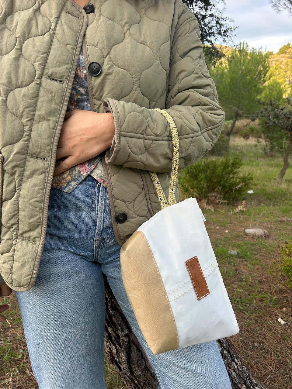 Cada modelo incluye un forro interior hecho con spinnaker recuperado, ideal para proteger tus objetos y de fácil limpieza. La cremallera náutica reforzada garantiza durabilidad, y el detalle único son las cuerdas recuperadas de barcos, que le dan carácter y autenticidad a cada bolso.